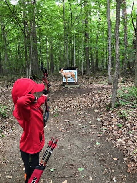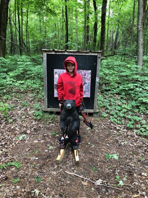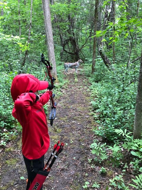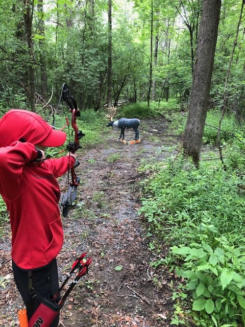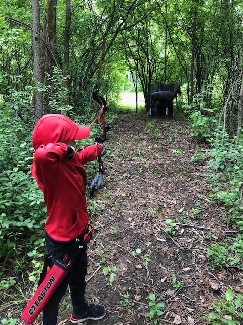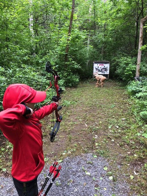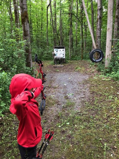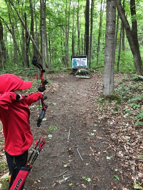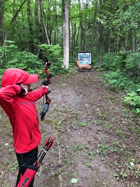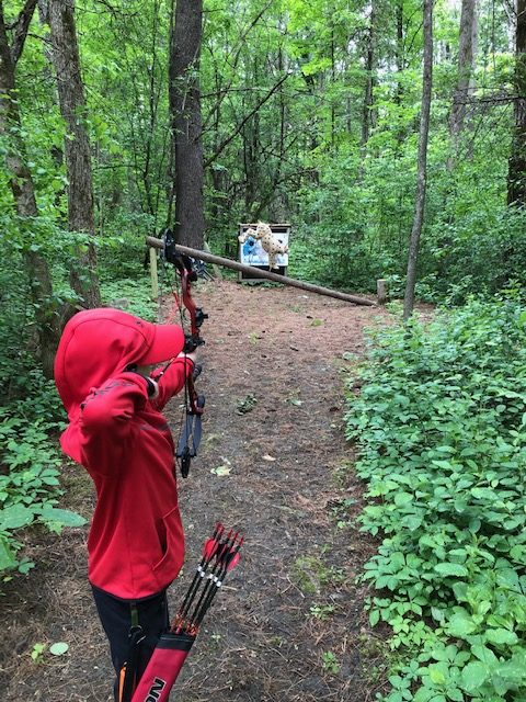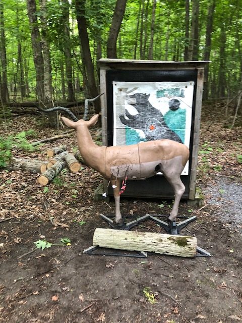 Ok, now it is Saturday, we want to go early so we have time to figure everything out and get on the course. We showed up around 8:10 or so, and were welcomed by a bunch of people from the Norfolk Archers Club. They helped us get registered and I paid my fees ($10). Liam was free and they also let him pick between a bunch of water bottles and apparently a few squirt guns, because that is what he picked. They also let him pick a paper target and gave him a free coupon for a scoop of ice cream at Stewarts. He was already pumped. I told the group that I have never shot a 3D shoot before and that I didn’t know where the course was. (I have been a member of the rod and gun club in the past, but only used the pistol and rifle ranges). They pointed us to the archery bales to warmup and then told us to follow the trail around shooting the targets. They told us we could go around twice or if it wasn’t too busy, we could shoot 2 arrows at each target and just go around once. Since we didn’t plan on a long amount of time, we planned to just shoot two arrows at each target once around. They offered me a scorecard and I just said that we would not score for this time, that perhaps next time we would.