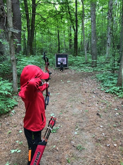 We got our gear together from the back of the car and started off. There was a group of 5-7 archers in front of us that were just leaving the practice area so Liam and I shot a few arrows to loosen up. I didn’t know how many groups were off in front of them, but I figured it would kind of be like a round of golf, if they were shooting a target, we would just wait our turn, especially not knowing how far it would be backed up at all.