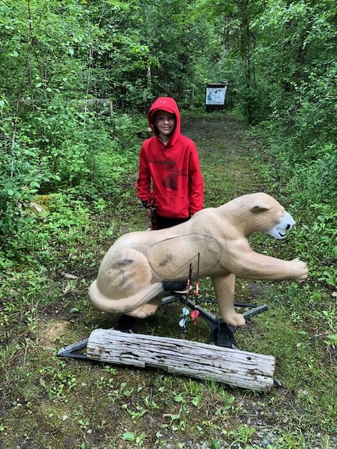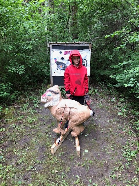Most of the targets had a target bale behind them as a backstop, which was nice as far as if you missed, but was a little distracting for Liam as some had multiple other animals or targets on them. At the end of the day, seems like a great thing for missed shots, but not sure how other clubs do this, especially if they use the lanes for other things like field archery. It was a really nice course with 20 targets, which were all different. Most of the shots were mostly level, with one target being up on an angled log and a few were slight downhill shots. Almost all of the shots were taken down a cleared lane, with you returning to the shooting end after collecting your arrows. The few (maybe 2-3) that you followed a secondary path from the target to the next shooting location were done in a way so that you were very clear of the target zone before you would stop for the next shot. I liked that most of the targets had the lane that you walked back up, seemed like a really safe method with no chance of having to unsafely return to where others were shooting.