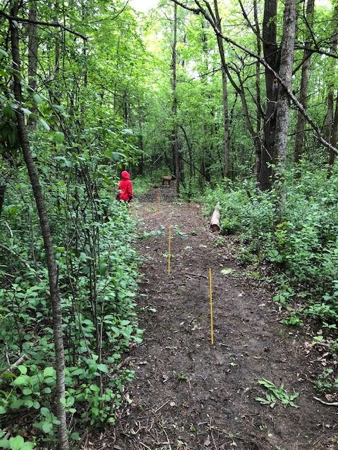Once we entered the woods, it was really easy to follow. The path was mostly a combo of cut grass with gravel and was really easy to walk. All of the target lanes were clearly marked with yellow diamond numbered signs. All of the targets were really easy to see/identify from the shooting location. The had different distances marked for the different classes (blue for open, different colors for the others – I didn’t really pay much attention as I just shot all of my shots from the farthest blue and Liam shot all of his from about 10 yards). Like a golf course, they had different markers for each circuit (plain blue for the first round, and blue with an orange clip for the second round).